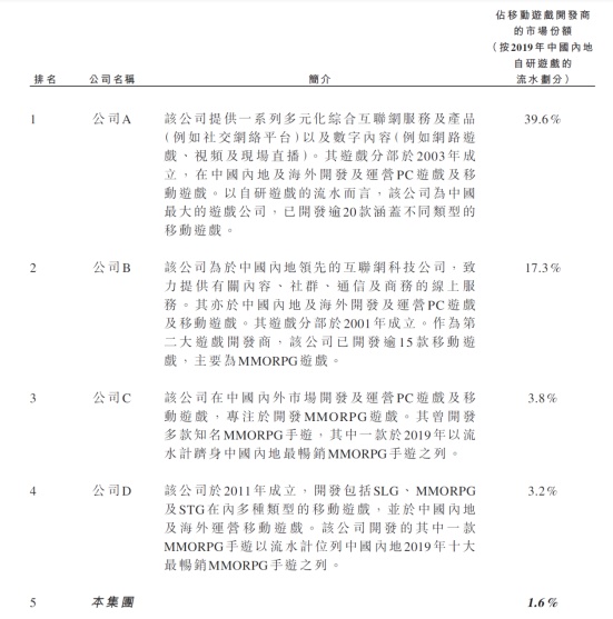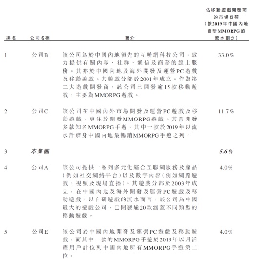 中国内地的移动游戏市场相对集中,公司为领先的移动游戏MMORPG开发商,竞争优势显著。按自研游戏于中国内地产生的总流水量计,公司在所有中国移动游戏开发商中排名第五,市场份额1.6%。按自研MMORPG于中国内地的总流水量计,公司在所有中国移动游戏开发商中排名第三,市场份额5.6%。
