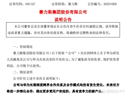 2月14日,赛力斯(601127.SH)公告,公司关注到网络上关于华为研发人员撤离及公司与华为关系改变的不实传言。公司针对上述不实传言说明如下:公司与华为长期深度跨界合作关系及合作模式均没有发生变化。未来双方将进一步深化合作,推出更多受用户欢迎的、具有竞争力的新产品。
