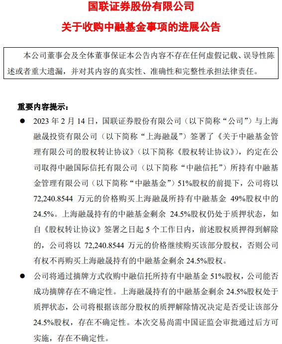 公告提到,上海融晟持有的中融基金剩余24.5%股权仍处于质押状态。如自《股权转让协议》签署之日起5个工作日内,前述股权质押得到解除,国联证券将以7.224亿元的价格继续购买该部分股权,否则国联证券有权不再购买上海融晟持有的中融基金剩余24.5%股权。