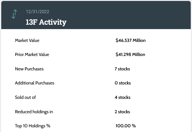 据统计,Scion第四季度持仓总市值为4653.7万美元,上一季度总市值为4129.8万美元,环比增长13%。该公司在四季度的投资组合中新增了7只个股,增持了0只个股,减持了2只个股,清仓了4只个股。其中前十大持仓标的占总市值的100%。