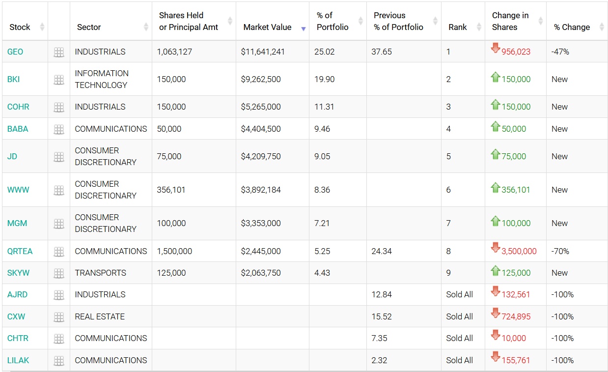 在前五大重仓股中,私人监狱运营商GEO惩教集团(GEO.US)位列第一,持仓约106.3万股,持仓市值约1164.1万美元,占投资组合比例为25.02%,较上季度持仓数量下降47%。