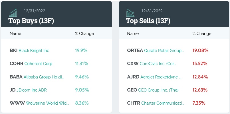 从持仓比例变化来看,前五大买入标的分别是:Black Knight、Coherent、阿里巴巴、京东、沃尔弗林集团。