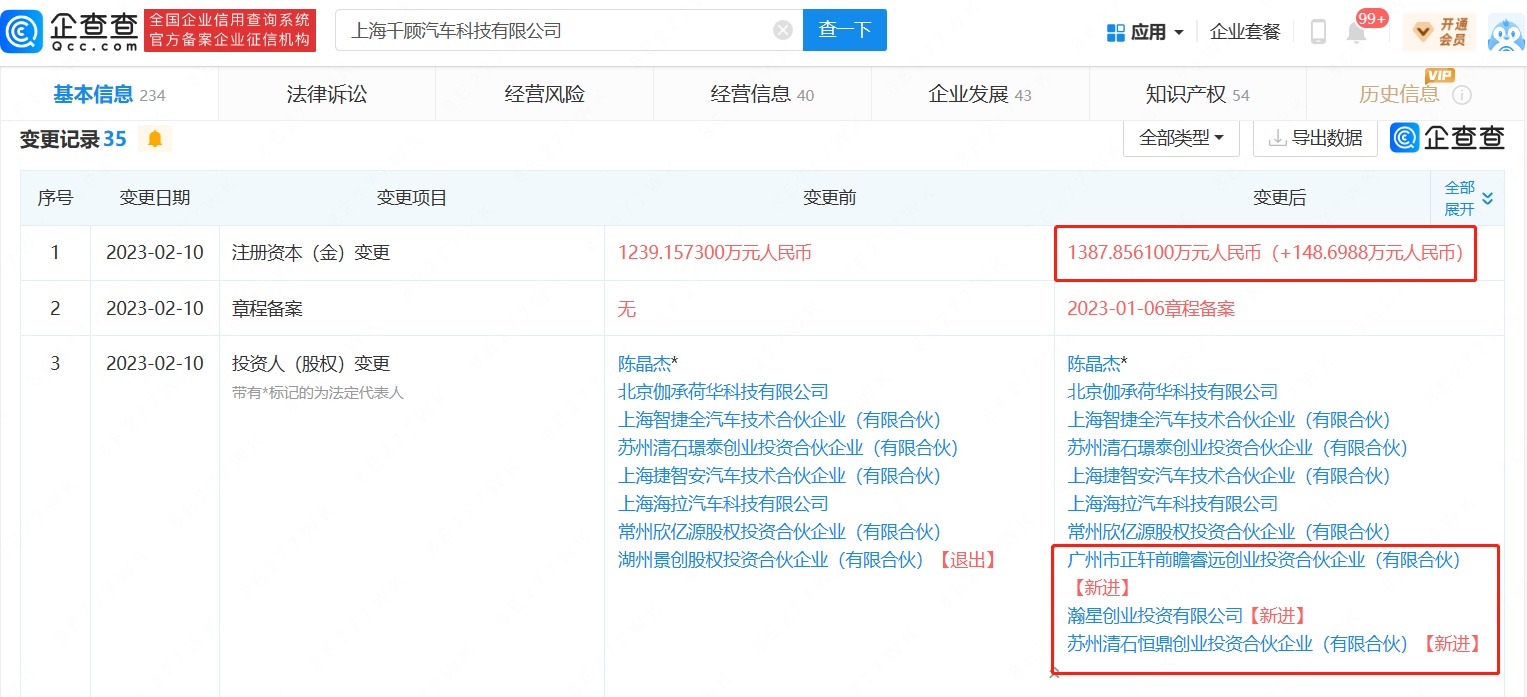 智通财经APP获悉,企查查APP显示,近日,上海千顾汽车科技有限公司(下称:千顾科技)发生工商变更,原股东湖州景创股权投资合伙企业(有限合伙)退出,新增小米旗下瀚星创业投资有限公司、广州市正轩前瞻睿远创业投资合伙企业(有限合伙)、苏州清石恒鼎创业投资合伙企业(有限合伙);同时注册资本由约1239万人民币增至约1388万人民币,增幅约12%。