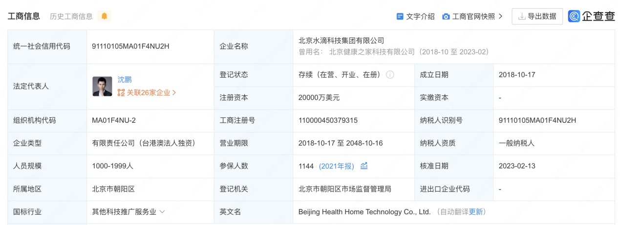 资料显示,北京水滴科技集团有限公司成立于2018年10月,法定代表人为沈鹏,注册资本为20000万美元,经营范围包含:技术开发、技术推广、技术转让、技术咨询、技术服务、软件开发、计算机系统服务、健康管理(须经审批的诊疗活动除外)、健康咨询(须经审批的诊疗活动除外)等。