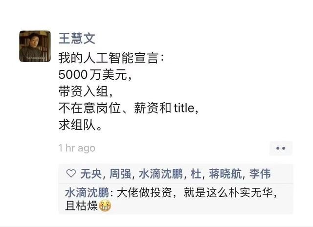 王慧文刚刚宣布进军人工智能领域,水滴公司几乎在同一时间更名为水滴科技集团,对于两件事情之间有无关联,水滴公司内部人士表示不予置评。