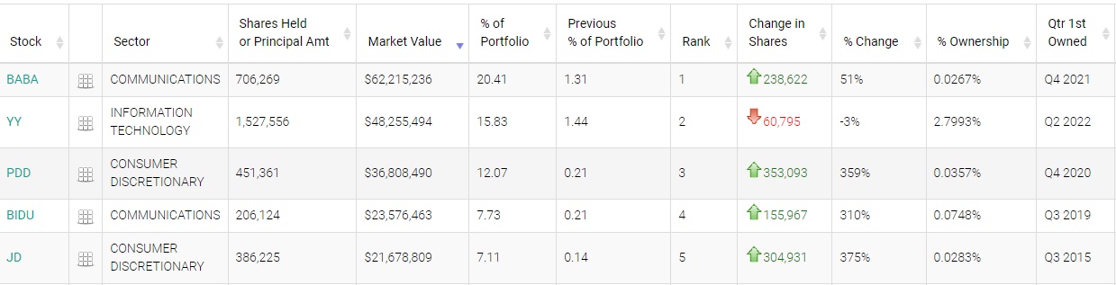 具体来看,阿里巴巴(BABA.US)位列第一,持仓约70.63万股,持仓市值约为6221.5万美元,占投资组合比例为20.41%,较上季度的持仓数量增加51%,上季度占投资组合比例为1.31%。