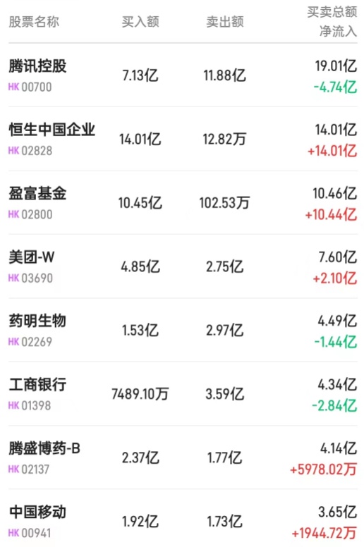 北水净买入最多的个股是盈富基金(02800)、恒生中国企业(02828)、美团-W(03690)。北水净卖出最多的个股是腾讯(00700)、工商银行(01398)。