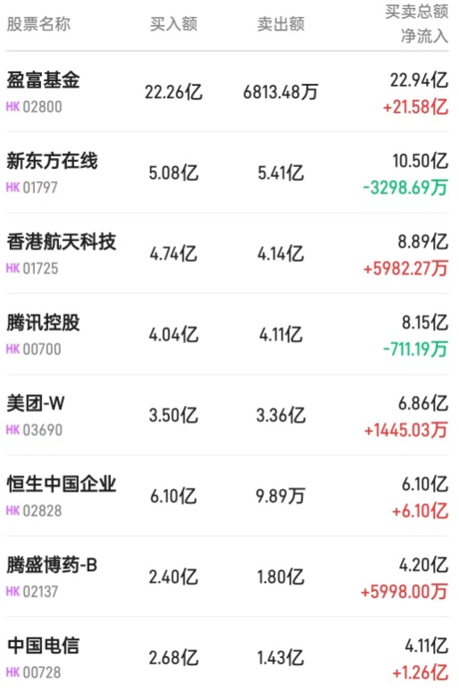 ETF方面,盈富基金(02800)、恒生中国企业(02828)分别获净买入32.01亿、20.1亿港元。此外,中芯国际(00981)获净买入4448万港元。