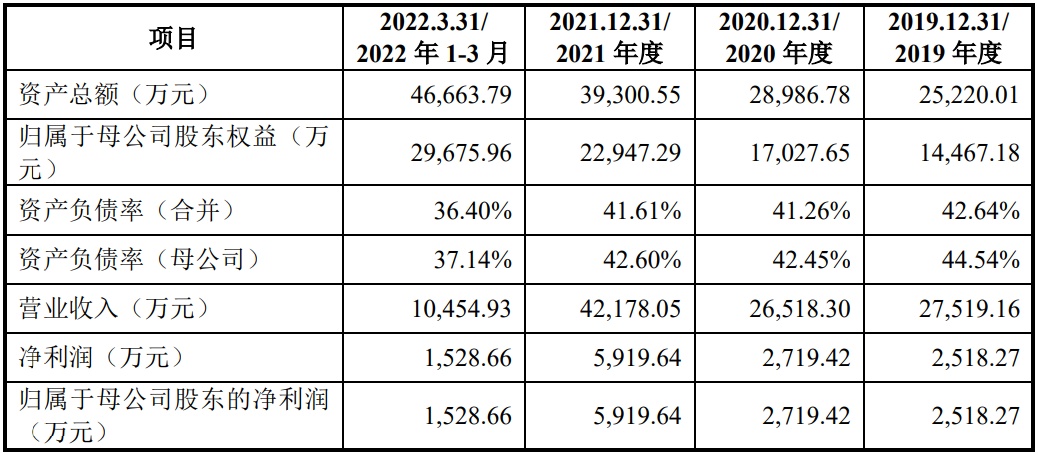财务方面,于2019年、2020年、2021年及2022年1-3月,公司实现营业收入分别约为2.75亿元(人民币,下同)、2.65亿元、4.22亿元及1.05亿元;同期,净利润分别为2518.27万元、2719.42万元、5919.64万元及1528.66万元。