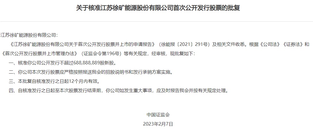 智通财经APP获悉,2月15日,证监会发布江苏徐矿能源股份有限公司(徐矿股份)首次公开发行股票的批复。证监会表示,核准徐矿股份公开发行不超过约6.89亿股。