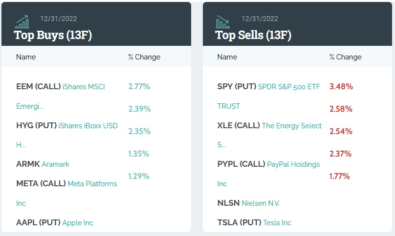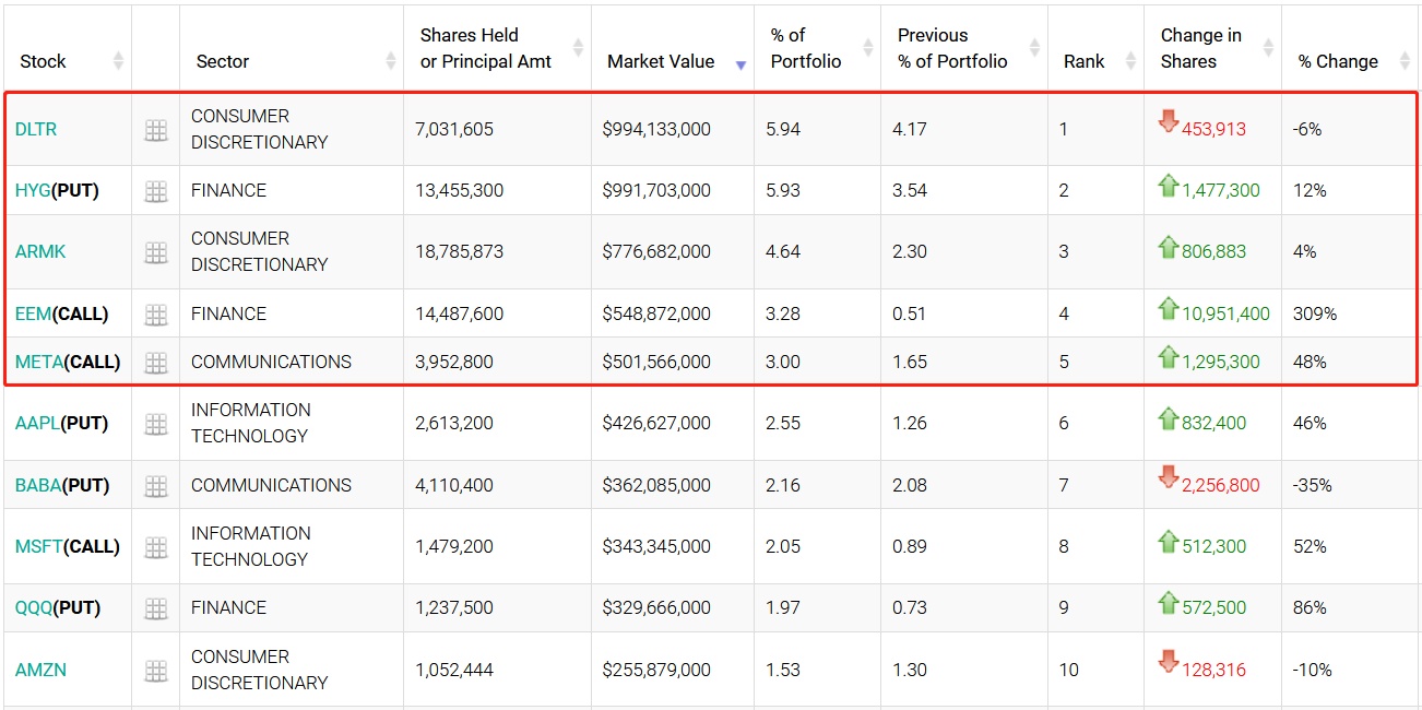 从持仓比例变化来看,前五大买入标的分别是:iShares MSCI新兴市场ETF看涨期权、iShares iBoxx高收益公司债券指数ETF看跌期权、Aramark、Meta看涨期权、苹果看跌期权(AAPL.US,PUT)。