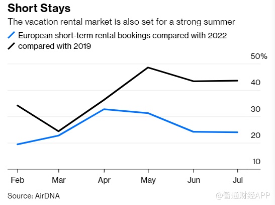 此前,易捷航空(ESYJY.US)和瑞安航空(RYAAY.US)都发布了乐观的展望。希思罗机场周一表示,该机场迎来了自2020年以来最繁忙的开年。酒店也从中受益,希尔顿酒店(HLT.US)和万豪酒店(MAR.US)公布了好于预期的2022年第四季度业绩。市场研究公司AirDNA的数据显示,欧洲2月至7月的短租预订量比2022年高出24.4%,比2019年高出32.6%。