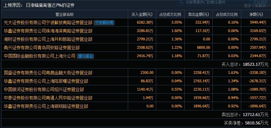 此外,光大证券宁波解放南路证券营业部、华鑫证券珠海海滨南路证券营业部分别买入6282.38万元、3286.81万元;国盛证券南昌金融大街证券营业部、华鑫证券上海陆家嘴证券营业部分别卖出3358.41万元、2765.14万元。