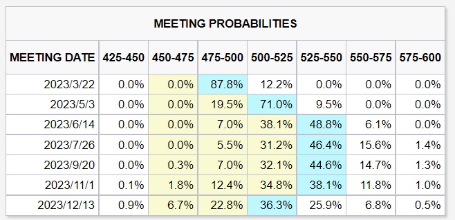 市场目前预计美联储将在接下来的3次会议上每次都批准加息25个基点,而不是此前市场预期的加息2次,然后可能暂停评估货币政策举措对通胀、劳动力市场和更广泛的经济增长的影响。CME“美联储观察工具”显示,仍有利率期货交易员押注美联储年前降息一次,不过交易员们对于美联储本轮加息周期的利率峰值预期已经由此前的5%-5.25%上升至5.25%-5.5%。