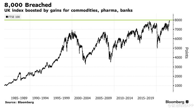 智通财经APP获悉,周三,英国富时100指数盘中首次突破8000点,权重股上涨和英镑下跌提振了这一大盘股指数。