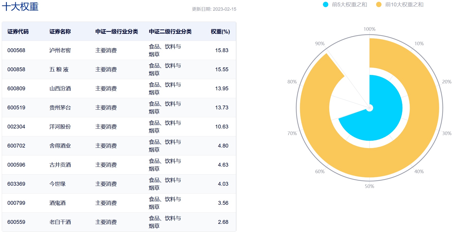 值得注意的是,中证指数官网显示,中证白酒指数为前十大重仓股权占比接近90%,前五大重仓股全部为高端、次高端白酒。前十大成分股包含贵州茅台、五粮液、泸州老窖、山西汾酒、洋河股份、古井贡酒、舍得酒业、今世缘、酒鬼酒、老白干酒。