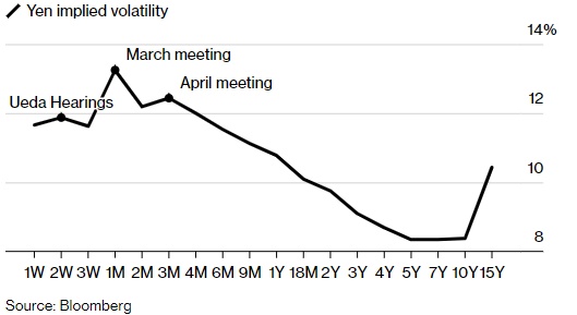 数据显示,在货币市场上,交易员们认为,在现任知事黑田东彦(Haruhiko Kuroda)于3月9日至10日召开最后一次政策会议期间,日元汇率隐含波动率将达到峰值,随后将在4月的上田首次会议上缓和。