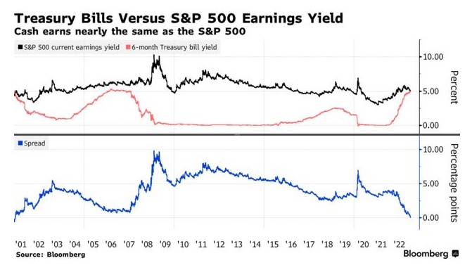 具体来说,目前6个月期国库券的收益率略低于5%,为2007年以来的最高水平。与此同时,标普500指数的收益率约为5.08%。两者之间的差距是自2001年以来股票所拥有的最小优势。
