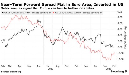 据悉,包括美国和新西兰在内的市场,近期远期利差(三个月期利率与18个月后投资者预期利率之间的差值)出现倒挂的现象,但欧元区的数据在1月份下降后仍大致与以往持平。小摩10国集团外汇策略负责人大卫·亚当斯表示,这是一个迹象,表明欧洲央行可以继续提高利率以抑制通胀,而不必过于担心影响经济。