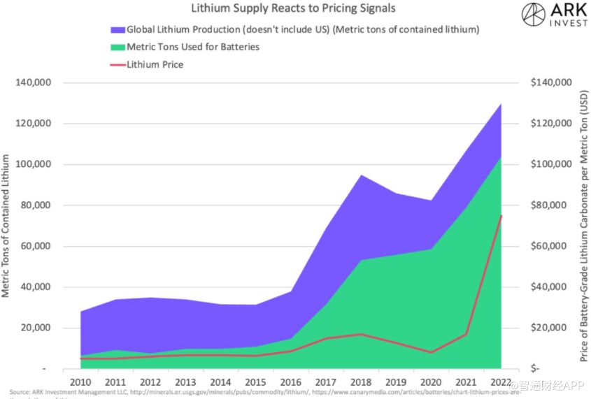 ARK 指出,锂的价格在2017年基本翻了一番,达到每吨1.5万美元,供应也做出了反应。目前锂的交易价格约为每吨7万美元。
