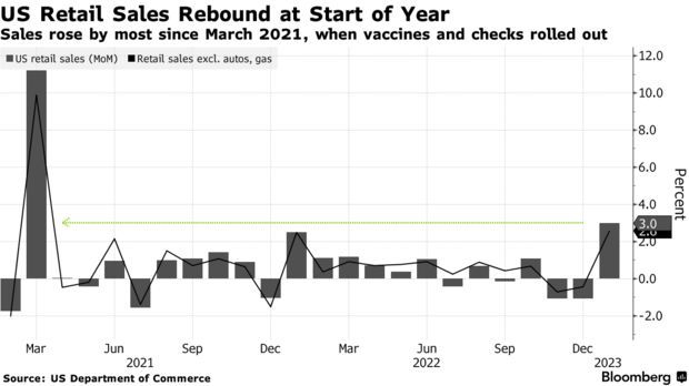智通财经APP获悉,周三公布的数据显示,素有“恐怖数据”之称的美国1月零售销售环比增长3%,创下创2021年3月以来最大增幅,远高于市场预期的1.8%。这表明,尽管通胀压力仍然很大,但消费者的需求依然保持强劲。