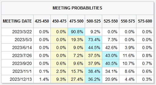 几位美联储官员周二强调了进一步加息的必要性,但对于距离多远才会停止加息表达了不同看法。交易员则继续认为,美联储将在3月和5月分别加息25个基点,6月加息25个基点的可能性超过40%,他们预计利率将在7月达到5.3%左右的峰值。