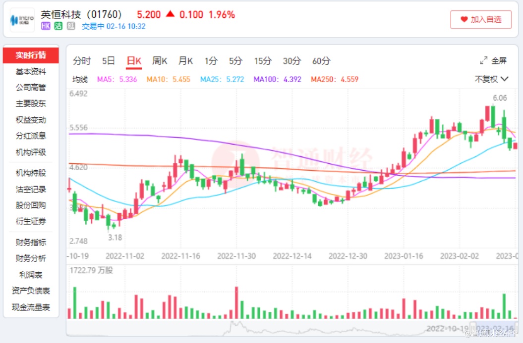 智通财经APP注意到,市场对英恒科技2022年业绩实现快速增长早有预期。公司股价自2022年10月底低点3.18港元,上涨至2023年2月9日高点6.06港元,期间最高涨幅为90.6%。然而,公司发布年度盈喜后,股价在2月14日高开低走,从最高上涨逾9%至收盘下跌2.92%。2月15日,公司股价继续下跌4.14%,表明市场对英恒科技的短期投资态度已出现较大分歧。
