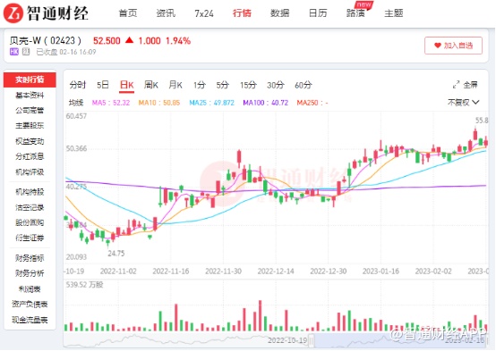 房地产市场反弹未至,相关股票已然闻声先涨。自去年10月以来,贝壳-W(02423)股价已从最低点的24.75港元回到了50港元上方,股价修复涨幅超100%,并于2月14日达到历史最高点55.8港元。