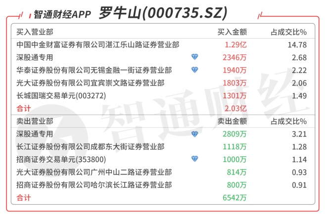 罗牛山(000735.SZ):多主力现身龙虎榜,深股通对倒卖出464万元,买一席位买入1.29亿元,一家独大,买三是知名游资苏南帮的席位买入1925万元,当日净买入1.47元,该股今日突破所有均线,重点观察买一的抛压能否承接。