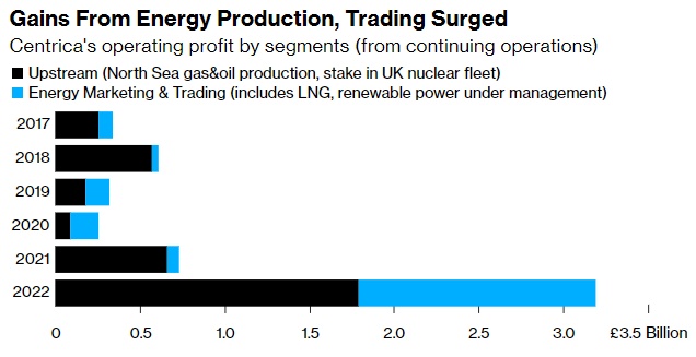 智通财经APP获悉,在电力和液化天然气交易的支持下,Centrica(CPYYF.US)通过其交易部门获得了创纪录的利润,帮助推动了该英国公用事业公司实现有史以来最好的收益。Centrica周四表示,其交易部门去年实现营业利润14亿英镑(合16.9亿美元),高于一年前的7000万英镑。该部门的业务包括管理的可再生能源资产和液化天然气交易。这与该公司利润丰厚的上游业务的业绩接近。在2022年开门红之后,液化天然气业务实现了年度盈利。
