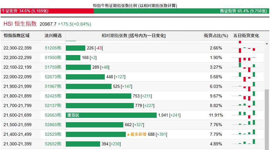 法兴恒指牛熊证街货分布图中的数据显示,熊证街货重货区在21600-21699区间,该区间最新熊证数量为1041张,较上一交易日增加241张;最多新增在21400-21499区间,该区间最新熊证数量为688张,较上一交易日增加391张。