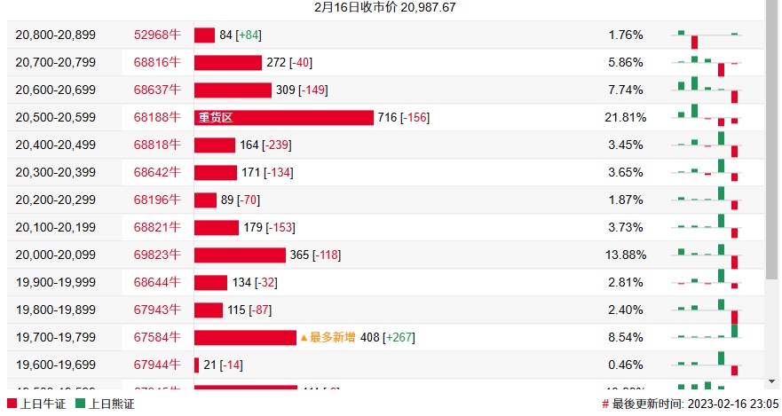 牛证街货重货区在20500-20599区间,该区间最新牛证数量为716张,较上一交易日减少156张;最多新增在19700-19799区间,该区间最新牛证数量为408张,较上一交易日增加267张。
