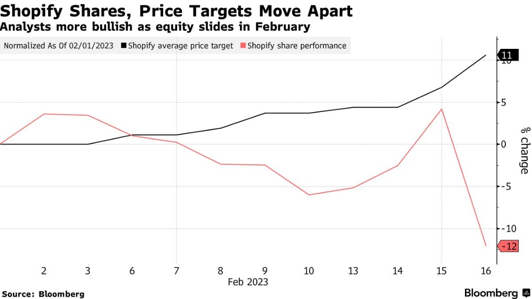 智通财经APP获悉,Shopify(SHOP.US)公布第四季度业绩后,得到了华尔街分析师的好评。当地时间周四,十几位分析师上调了Shopify的目标价,将市场的平均目标价提高了6%。然而,该公司当天股价仍遭受了重创。截至收盘,该股跌超15%,报44.91美元,是标准普尔/多伦多证券交易所综合指数中表现最差的股票。