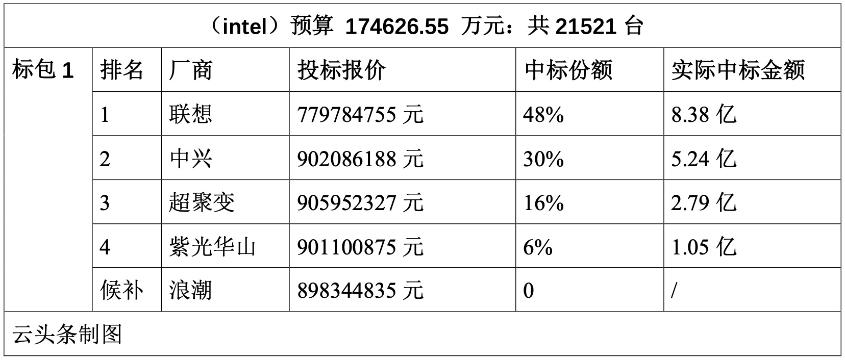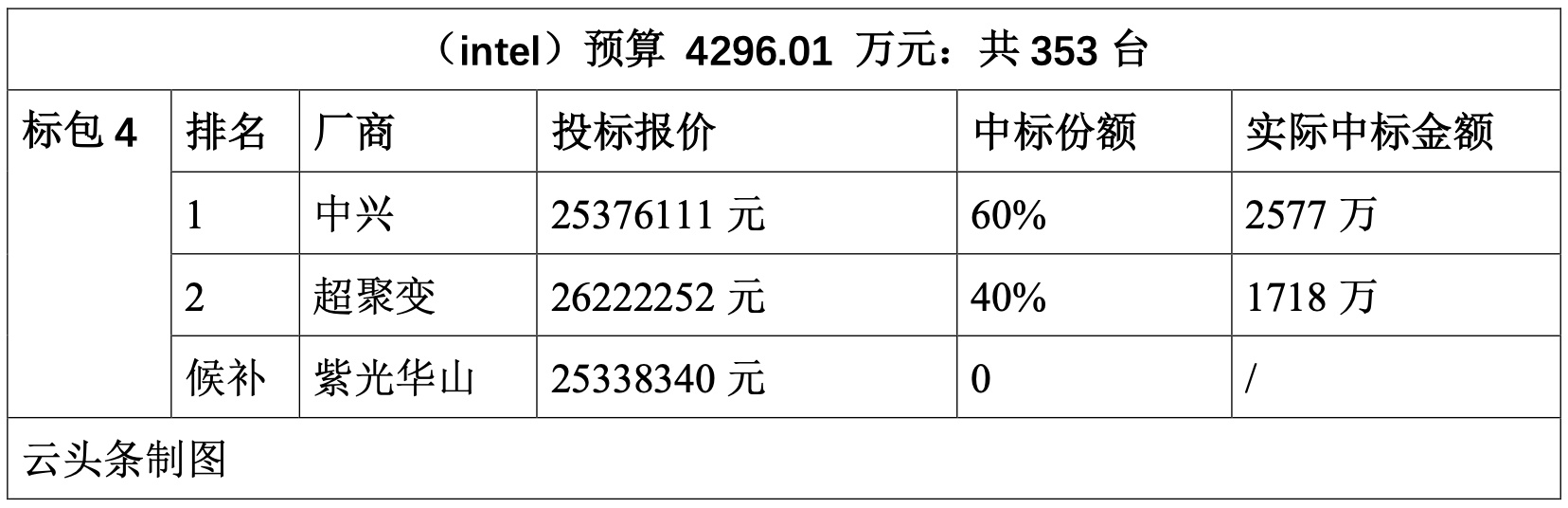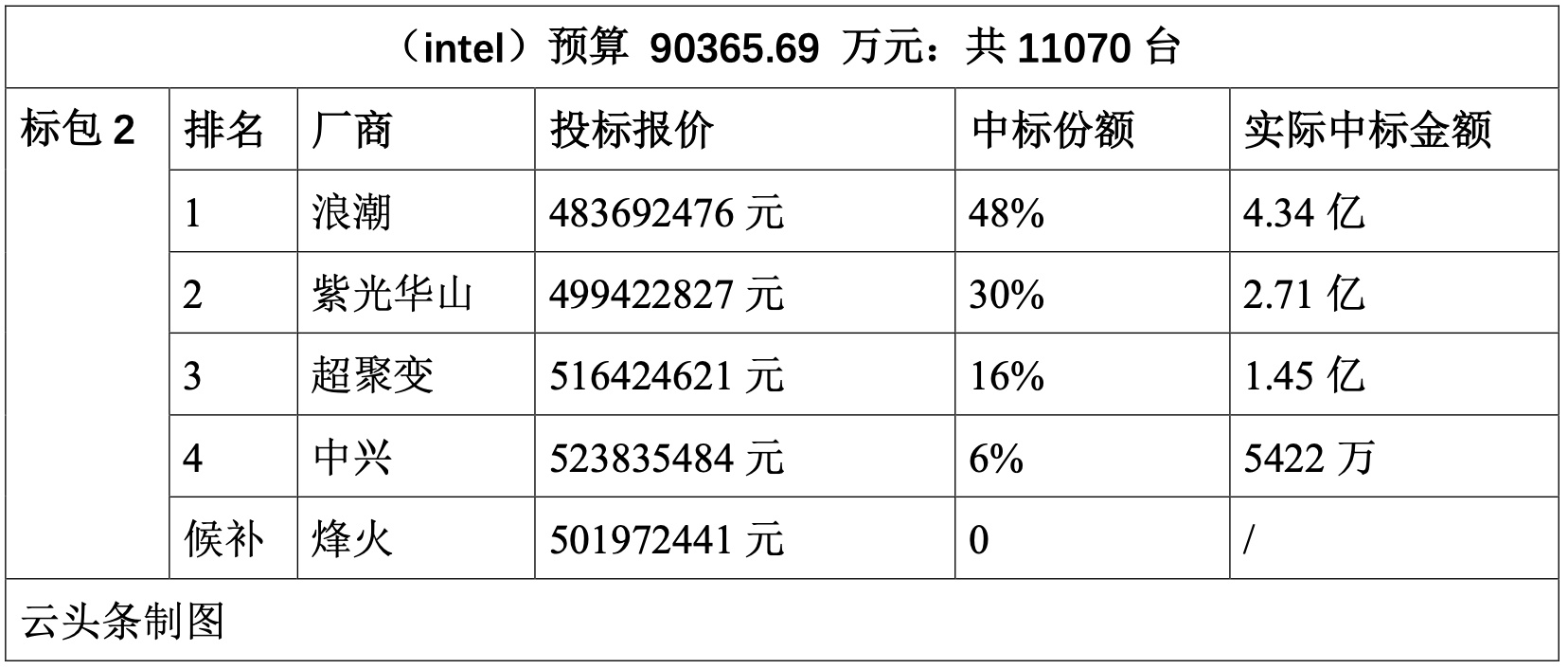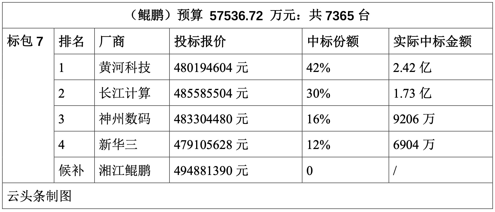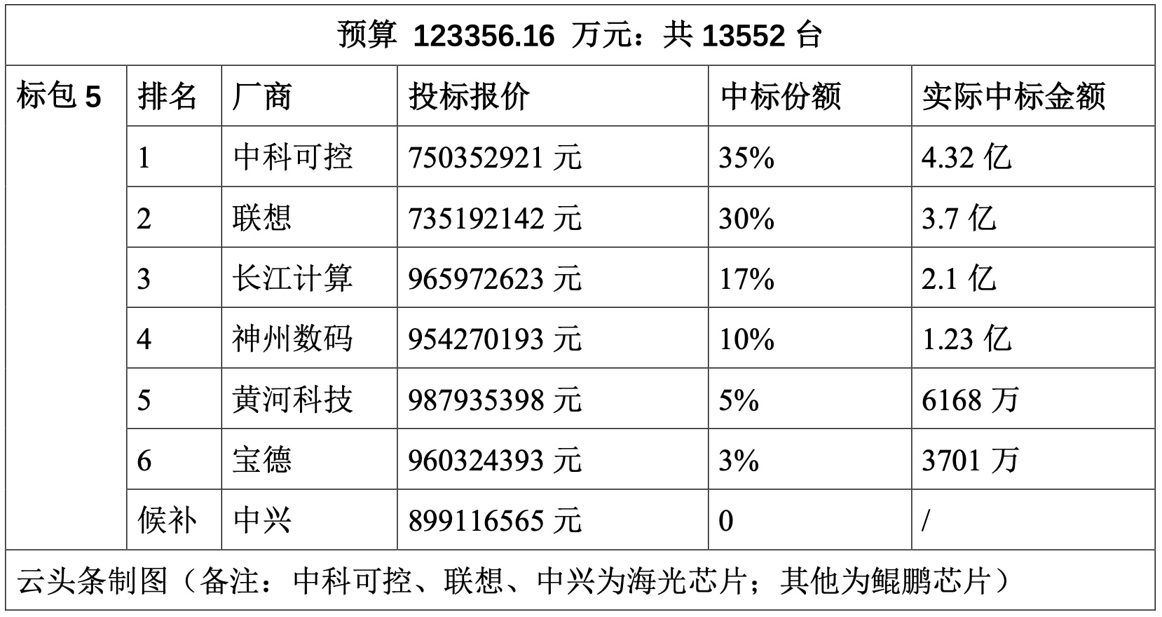 标包5:(海光芯片)竞得 8809 台 8.02 亿、(鲲鹏芯片)竞得 4743 台 4.32 亿。