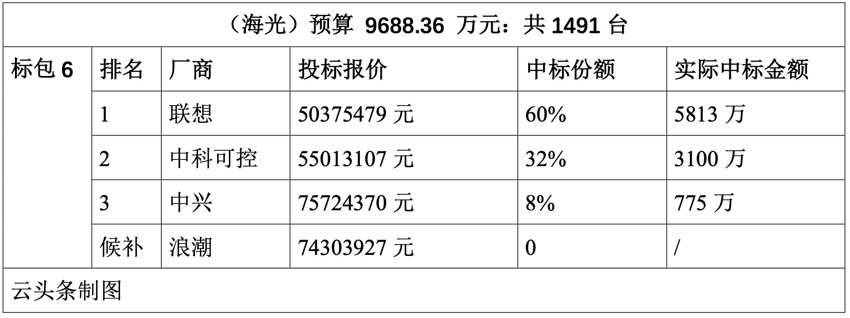 标包6:联想比中兴价格低 2535 万元;中科可控比中兴低 2071 万。