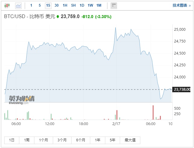 智通财经APP获悉,由于美联储官员的强硬言论,以及美国监管力度加大的进一步迹象传播了谨慎情绪,比特币出现约一周以来最大跌幅,一度跌超4%。截至发稿,比特币价格跌3.41%,报23779美元/枚。Ether、Polkadot和Avalanche等较小的代币也出现了下跌。