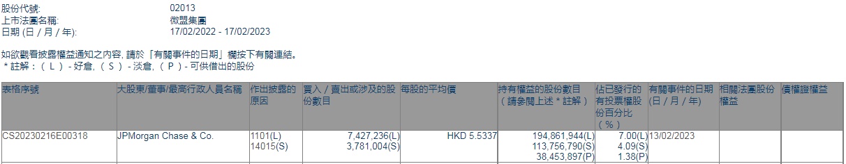 智通财经APP获悉,香港联交所最新资料显示,2月13日,小摩增持微盟集团(02013)742.7236万股,每股作价5.5337港元,总金额约为4110.01万港元。增持后最新持股数目约为1.95亿股,最新持股比例为7.00%。