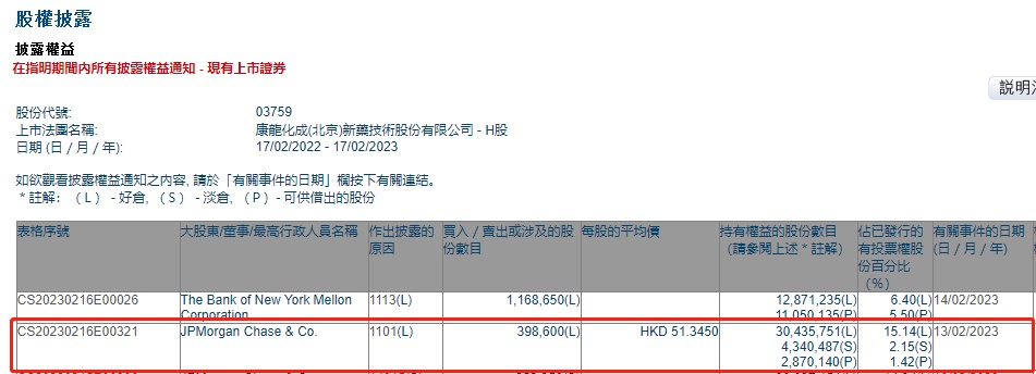智通财经APP获悉,香港联交所最新资料显示,2月13日,小摩增持康龙化成(03759)39.86万股,每股作价51.345港元,总金额约为2046.61万港元。增持后最新持股数目约为3043.58万股,最新持股比例为15.14%。