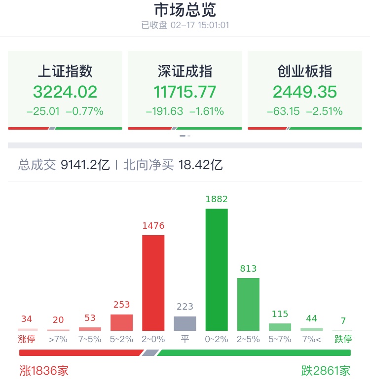 截至收盘,沪指跌0.77%,报3224.02点;深成指跌1.61%,报11715.77点;创业板指跌2.51%,报2449.35点。
