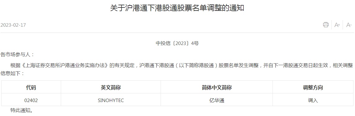 智通财经APP获悉,2月17日,上海证券交易所公告称,根据《上海证券交易所沪港通业务实施办法》的有关规定,亿华通(02402)获调入沪港通下的港股通,并自下一港股通交易日起生效。