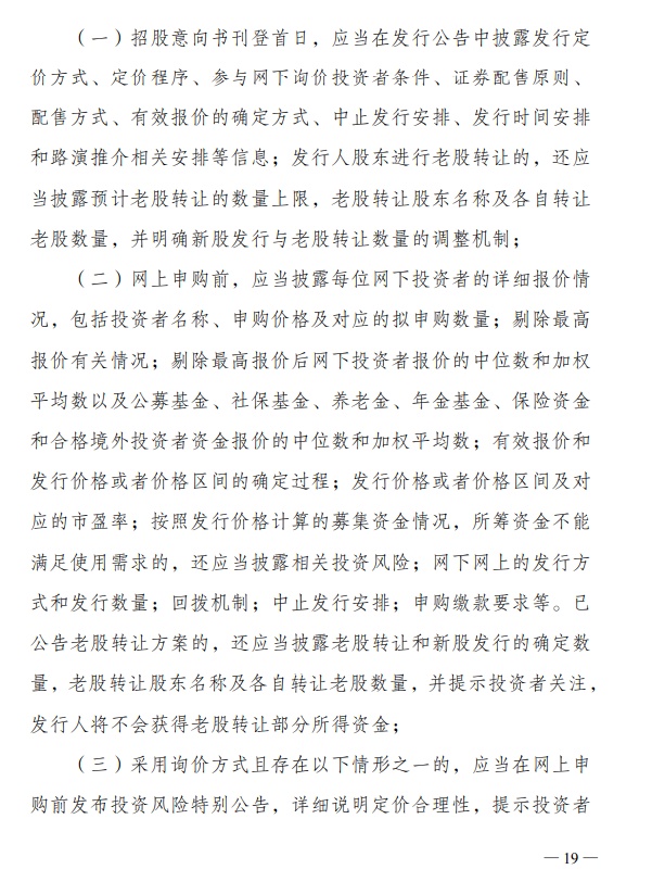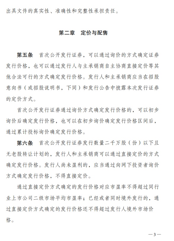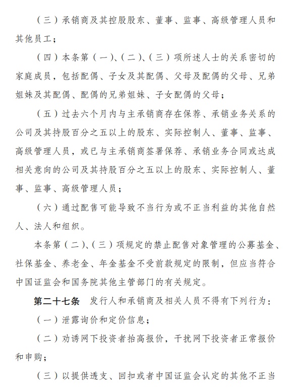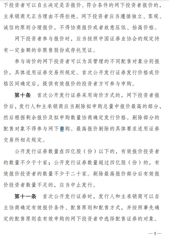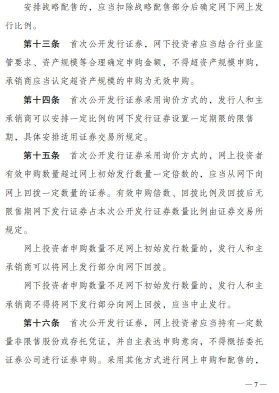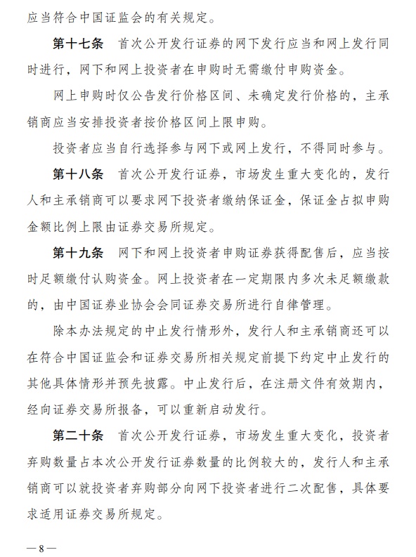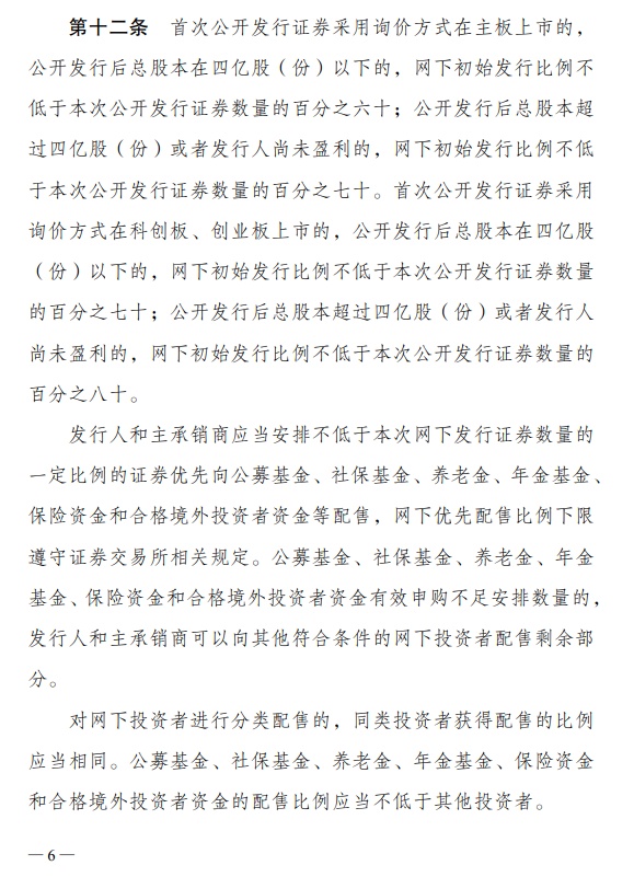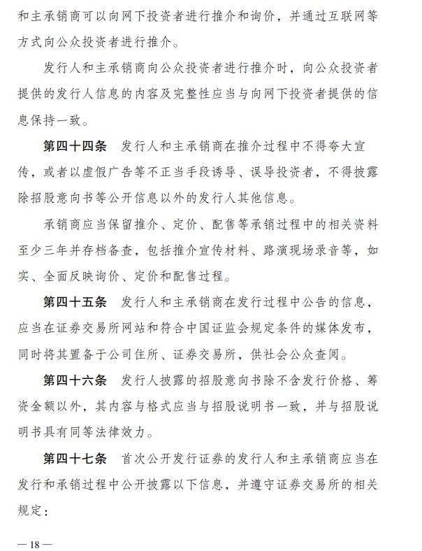 智通财经APP获悉,2月17日,证监会修订发布《证券发行与承销管理办法》,自公布之日起施行。对新股发行价格、规模等不设任何行政性限制,完善以机构投资者为参与主体的询价、定价、配售等机制,平衡好发行人、承销机构和投资者之间的利益,实现新股市场化发行。在发行结果公告中披露获配投资者名称以及每个获配投资者的报价、申购数量和获配数量等,并明确说明自主配售的结果是否符合事先公布的配售原则;对于提供有效报价但未参与申购,或实际申购数量明显少于报价时拟申购量的投资者应当列表公示并着重说明;披露网上、网下投资者获配未缴款金额以及主承销商的包销比例,列表公示获得配售但未足额缴款的网下投资者;披露保荐费用、承销费用、其他中介费用等发行费用信息。