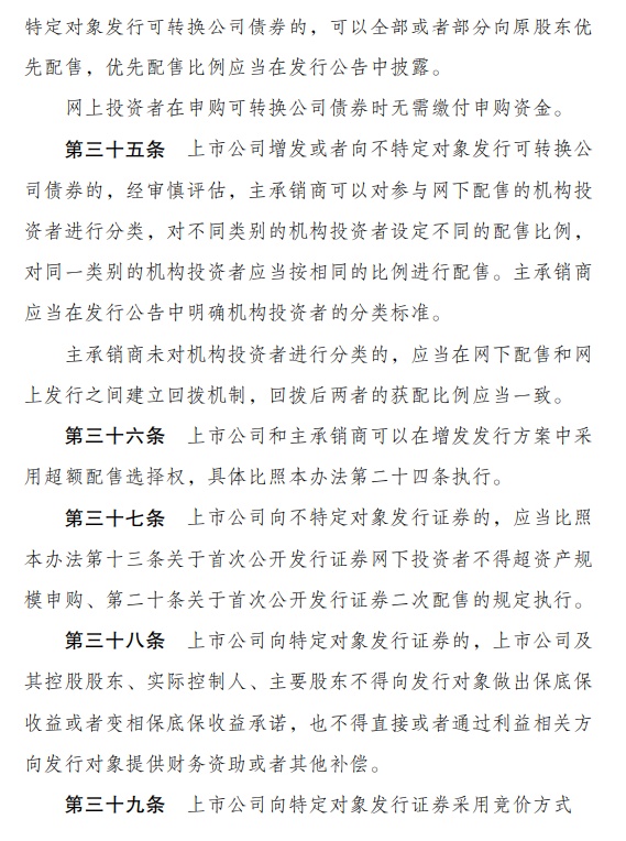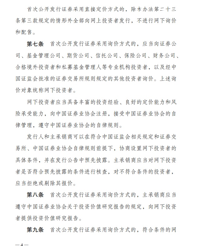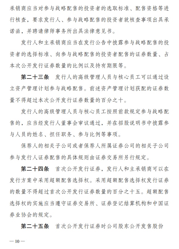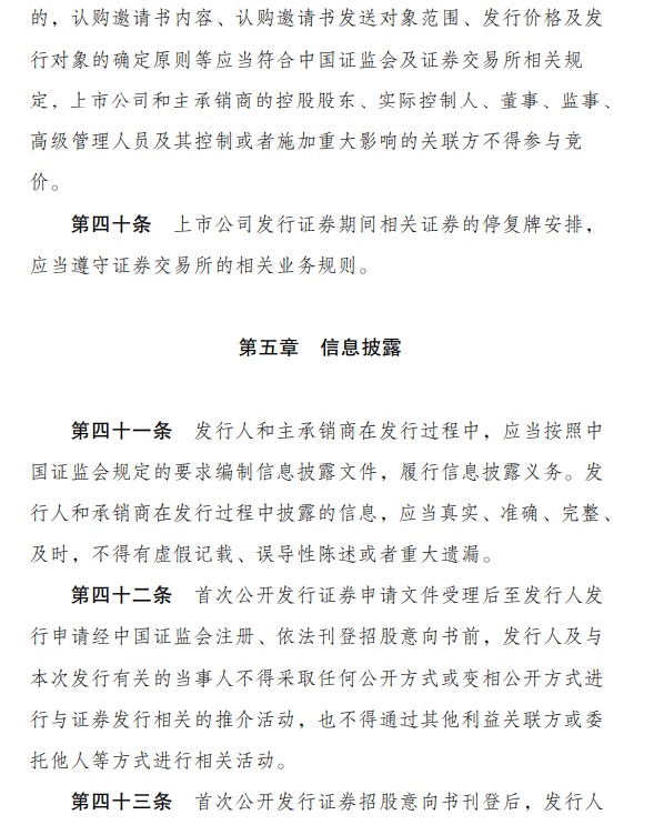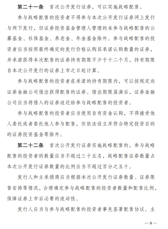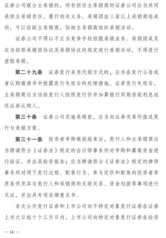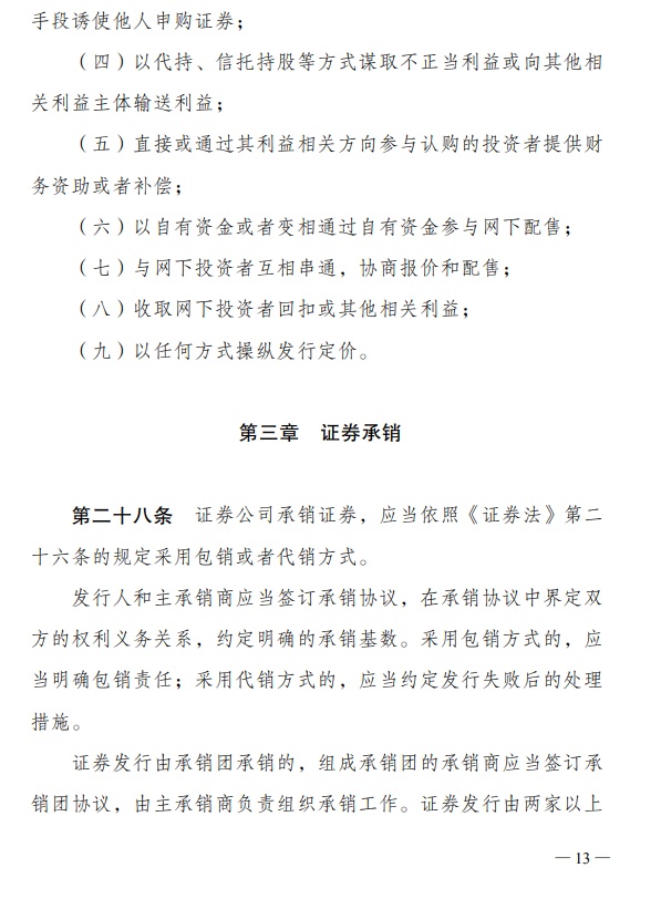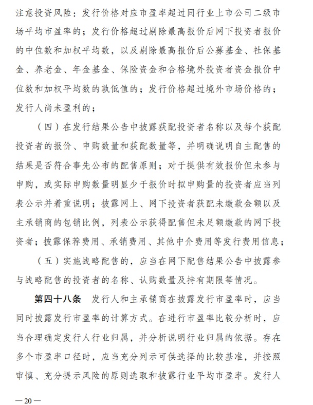 智通财经APP获悉,2月17日,证监会修订发布《证券发行与承销管理办法》,自公布之日起施行。对新股发行价格、规模等不设任何行政性限制,完善以机构投资者为参与主体的询价、定价、配售等机制,平衡好发行人、承销机构和投资者之间的利益,实现新股市场化发行。在发行结果公告中披露获配投资者名称以及每个获配投资者的报价、申购数量和获配数量等,并明确说明自主配售的结果是否符合事先公布的配售原则;对于提供有效报价但未参与申购,或实际申购数量明显少于报价时拟申购量的投资者应当列表公示并着重说明;披露网上、网下投资者获配未缴款金额以及主承销商的包销比例,列表公示获得配售但未足额缴款的网下投资者;披露保荐费用、承销费用、其他中介费用等发行费用信息。