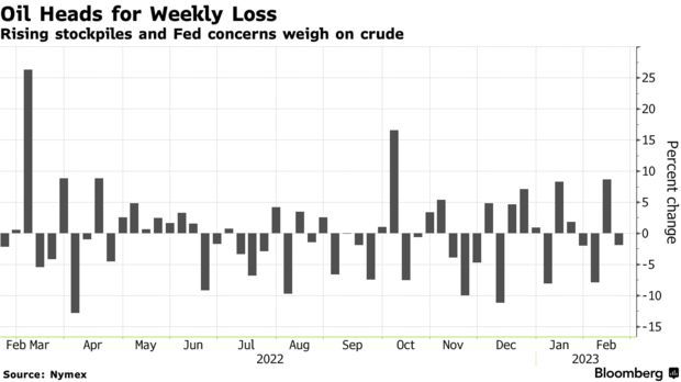 周二公布的数据显示,美国截至2月10日当周API原油库存增加1050.7万桶,远超预期的32.1万桶,这在一定程度上令油价承压。此外,交易员们正在关注美联储是否会继续加息以遏制通胀。瑞银大宗商品分析师Giovanni Staunovo表示:“市场担心美联储将在下次会议上加息50个基点,这将支撑美元并打压油价。”