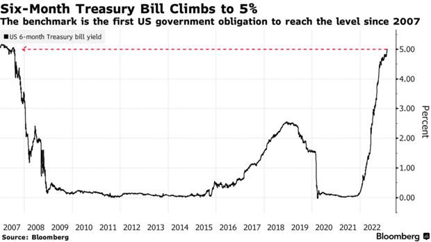 智通财经APP获悉,随着交易员对美联储进一步加息的预期急剧升温,6个月期美国国库券收益率在上周达到了5%,这是自2007年以来美国国债收益率第一次达到这个门槛。除了与加息预期相关之外,6个月期美国国库券的收益率还反映了与联邦债务上限相关的额外风险。