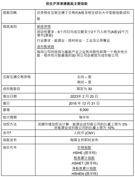 恒生指数公司行政总裁巫婉雯表示:“自2010年起,恒生指数公司致力编制创新ESG主题指数以满足日益增长的可持续发展投资需求。有见氢能将为清洁能源转型做出重大贡献,我们推出恒生沪深港通氢能主题指数,冀助关注减碳主题的投资者把握低碳转型带来的投资机遇。”