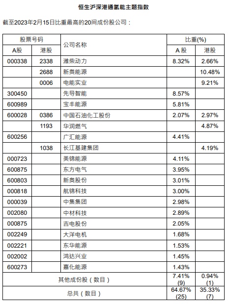 智通财经APP获悉,2月20日,恒生指数公司推出恒生沪深港通氢能主题指数,进一步丰富旗下ESG产品系列,以满足对可持续投资策略有兴趣的投资者之需求。其中,截至2023年2月15日比重最高的前5家公司为潍柴动力(02338)、新奥能源(02688)、电能实业(00006)、先导智能(300450.SZ)以及宝丰能源(600989.SH);A股成分股总占比为64.67%,港股成分股总占比为35.33%。