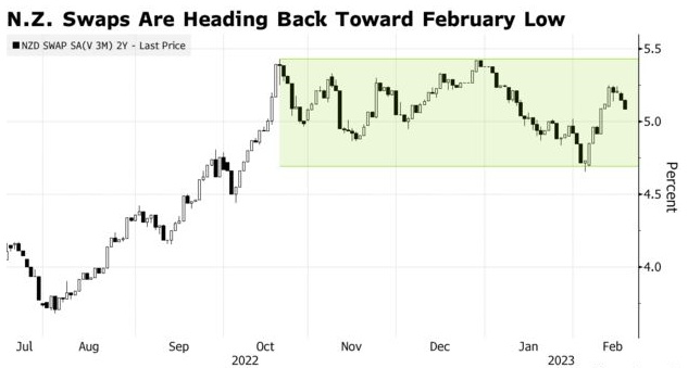 由于过去三周的恶劣天气预计会对新西兰经济造成损害,这也促使金融市场下调了利率峰值预期。两年期利率掉期显示,交易员对新西兰联储利率峰值的预期已从上周的5.25%跌至5.085%。今年2月初,这一利率水平曾低至4.70%。