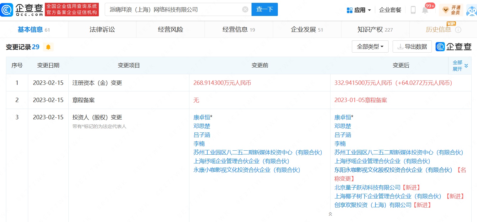智通财经APP获悉,企查查APP显示,近日,放学嗨关联公司派嗨拜浪(上海)网络科技有限公司发生工商变更,股东新增抖音旗下北京量子跃动科技有限公司、上海椰子树下企业管理合伙企业(有限合伙)、创享欢聚投资(上海)有限公司等;注册资本由268.9万人民币增至332.9万人民币,增幅约23.8%。