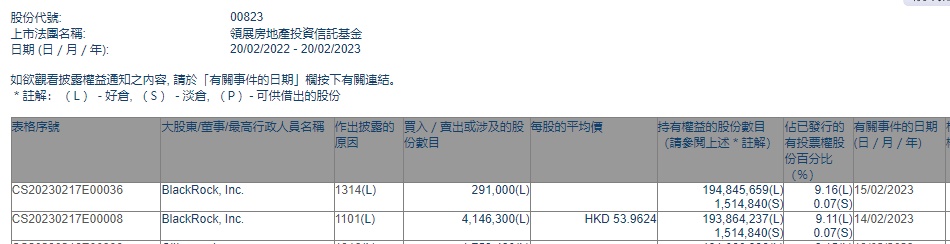 智通财经APP获悉,香港联交所最新资料显示,2月14日,贝莱德增持领展房产基金(00823)414.63万股,每股作价53.9624港元,总金额约为2.24亿港元。增持后最新持股数目约为1.94亿股,最新持股比例为9.11%。