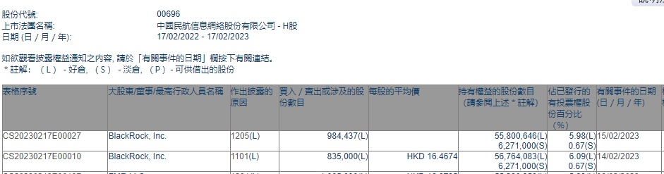 智通财经APP获悉,香港联交所最新资料显示,2月14日,贝莱德增持中国民航信息网络(00696)83.5万股,每股作价16.4674港元,总金额约为1375.03万港元。增持后最新持股数目约为5676.41万股,最新持股比例为6.09%。